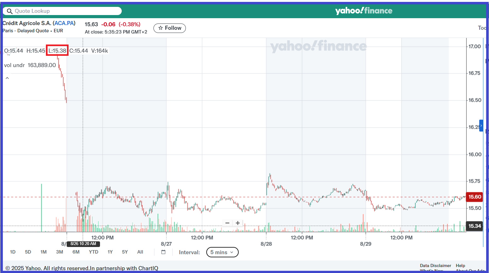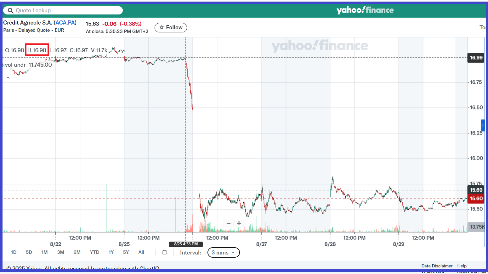 En effet, lorsque Bayrou annonçait l’engagement de l’article 49.1 le 26 août, le cours de Crédit Agricole est passé de 16,99 € à 16 heures 30, heure du début de sa déclaration…