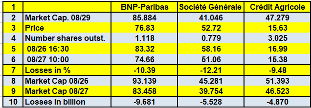 Pour plus de clarté, j’ai récapitulé dans un tableau les pertes, en pourcentage et en milliards d’euros, enregistrées dans les capitalisations boursières de ces trois big banks les 26 et 27 août, ce qui conduit à une perte globale de… 20, 078 milliards d’euros très exactement !