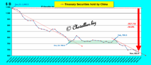Tout le monde dit et répète que les dirigeants chinois se débarrassent de la dette américaine depuis que le Donald a pris ses fonctions présidentielles, ce qui correspond apparemment à la réalité dans la mesure où les bons du Trésor détenus par la Chine, c’est-à-dire par les autorités chinoises, à savoir la banque centrale (la PBOC, People’s Bank of China), diminuent effectivement,