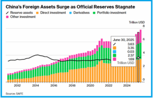 Cependant cette observation et les conclusions qui peuvent en être tirées sont trompeuses car en réalité, les actifs détenus hors de la Chine par des entités chinoises sont en constante augmentation depuis au moins fin 2010 en atteignant un plus haut record à 11 510 milliards de dollars fin juin 2025, derniers chiffres publiés à ce jour d’après les chiffres publiés par le FMI,