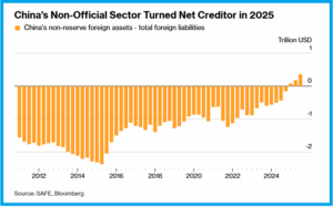 Grâce à son système productif largement excédentaire, la Chine devient une puissance financière internationale dominante et pour la première fois de son histoire, le secteur privé est devenu en 2025 créditeur net vis-à-vis de l’extérieur.