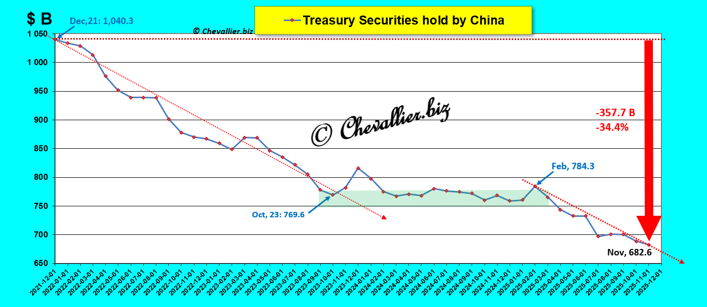 Ces actifs financiers détenus par ces entités chinoises sont donc considérables et ils sont en forte augmentation surtout grâce aux excédents de la balance commerciale qui se sont montés à un plus haut record de 1 200 milliards de dollars en 2025… malgré la guerre commerciale dominée par les droits de douane exorbitants imposés par le Donald !