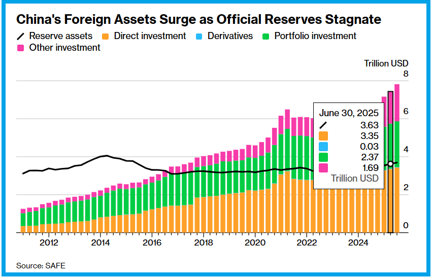 Ces investissements financiers sont surtout des investissements directs d’entreprises chinoises dans des entreprises dans le monde (dont dans les pays dits du bloc américain), pour 3 350 milliards de dollars (à fin juin), c’est-à-dire pour un total proche du montant des réserves officielles de la Chine détenues par la PBOC qui se montaient alors à 3 630 milliards de dollars, et des investissements en portefeuille se montant globalement à 2 370 milliards de dollars,