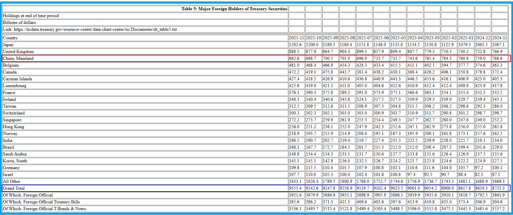 Pour information, copie d’écran des données officielles de la dette fédérale des États-Unis détenue par des étrangers.