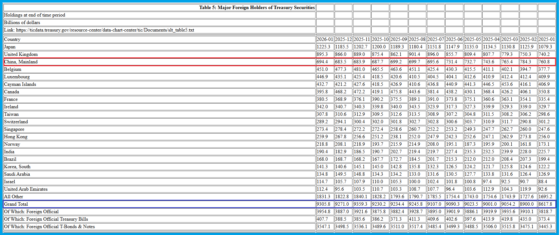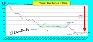 Depuis fin juillet 2025, le montant des bons du Trésor des États-Unis détenus par les autorités chinoises fluctue en se maintenant juste un peu en deçà de 700 milliards de dollars, ce qui signifie que les autorités chinoises continuent à acheter un peu de ces titres car une partie de ceux qu’ils détenaient auparavant arrivent inévitablement à leur échéance,