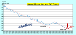 A ce jour, cet écart entre les mauvais bons à 10 ans des Trésors italien et français est inférieur à celui qui précédait le début des grandes turbulences associées à la Grande récession de 2008 !