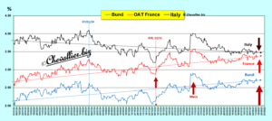 Pour rappel, la hausse des rendements de ces bons signifie que leurs prix baissent et inversement. Les investisseurs vendent donc du Bund et de l’OAT française et achètent préférentiellement des bons italiens.
