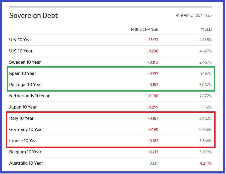 La décadence de l’Europe et de la France en particulier se manifeste dans l’évolution des rendements des bons à 10 ans des Trésors de référence.