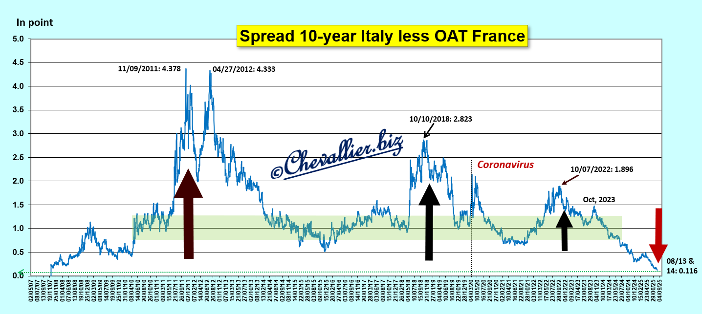 A ce jour, cet écart entre les mauvais bons à 10 ans des Trésors italien et français est inférieur à celui qui précédait le début des grandes turbulences associées à la Grande récession de 2008 !