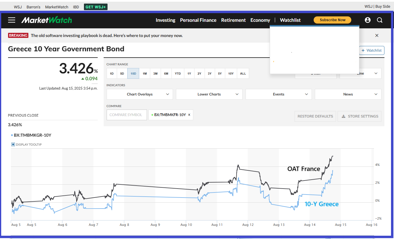 Comme me l’a fait remarquer Corinne, ma fidèle lectrice, encore et toujours fort pertinente, les rendements des mauvais bons à 10 ans du Trésor de la Grèce (à 3,426 % le 15 août) sont inférieurs à ceux de l’OAT française à 10 ans (3,460 %) depuis le 4 août, ce qui signifie que la France est maintenant notée moins bien que la Grèce !
