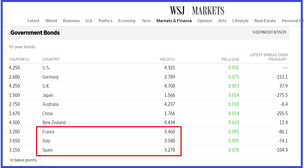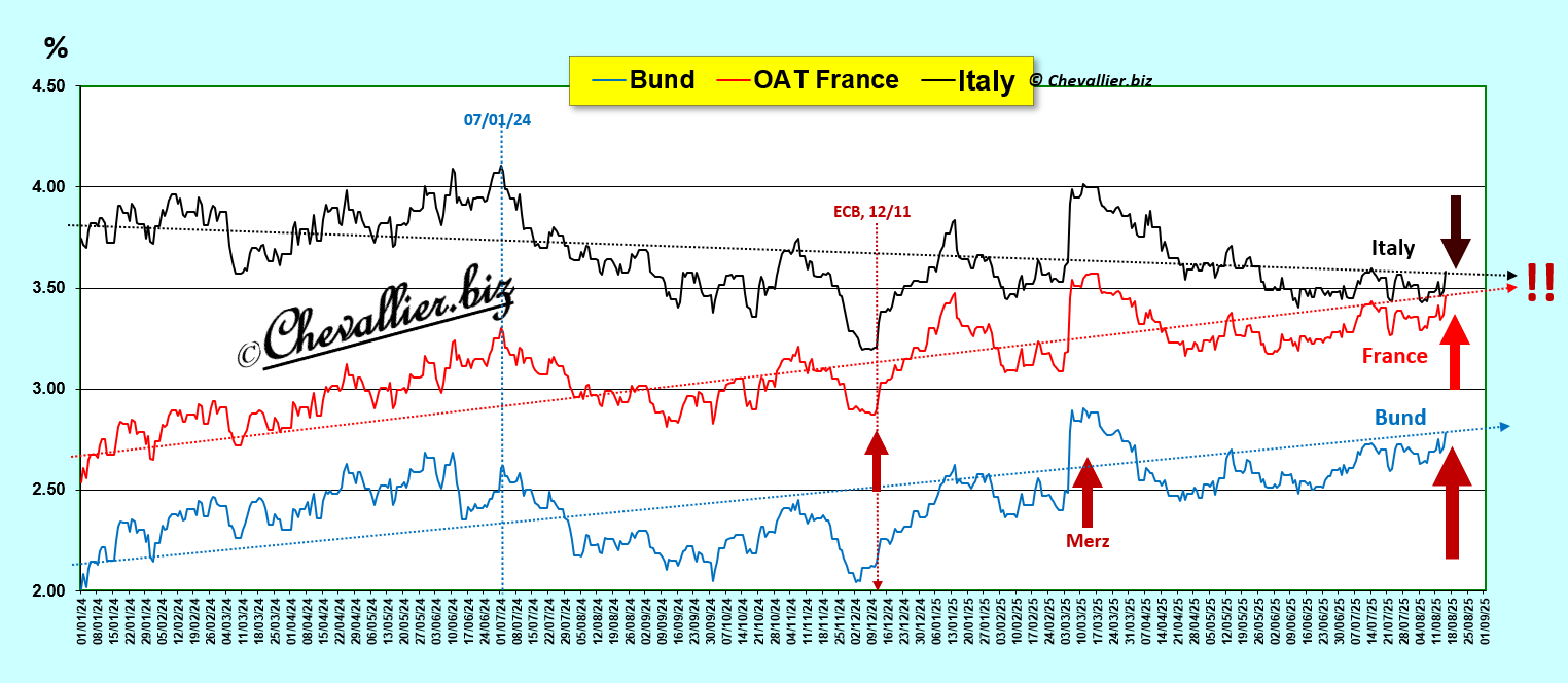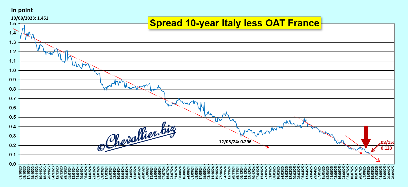 A la clôture de la séance du 15 août, les rendements des mauvais bons à 10 ans du Trésor français étaient à 3,460 % alors que les rendements de son homologue italien étaient à 3,580 %…