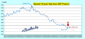 … ce qui signifie que leur écart est légèrement remonté à 12 points de base alors qu’il était tombé à 0,116 point (ou 11,6 points de base) la veille, au plus bas de ce cycle, comme à la clôture de la séance du 13 août !