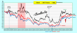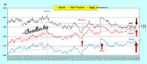 Pour rappel, la hausse des rendements de ces bons signifie que leurs prix baissent et inversement. Les investisseurs vendent donc du Bund et de l’OAT française et achètent préférentiellement des bons italiens.