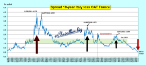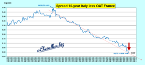 L’écart entre les rendements des bons à 10 ans du Trésor italien par rapport à leurs homologues français est donc passé en territoire négatif, ce qui ne s’est jamais produit depuis le début des turbulences financières qui ont précédé la Grande récession de 2008 !