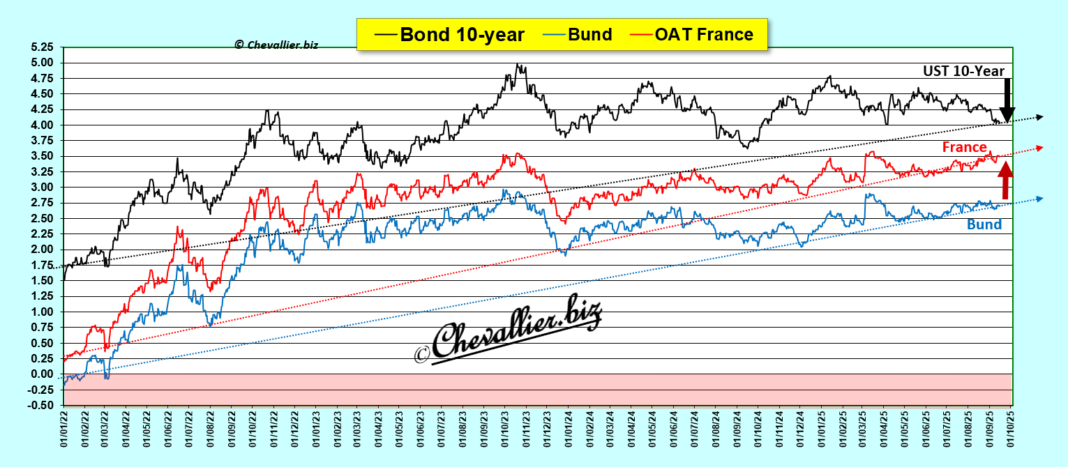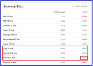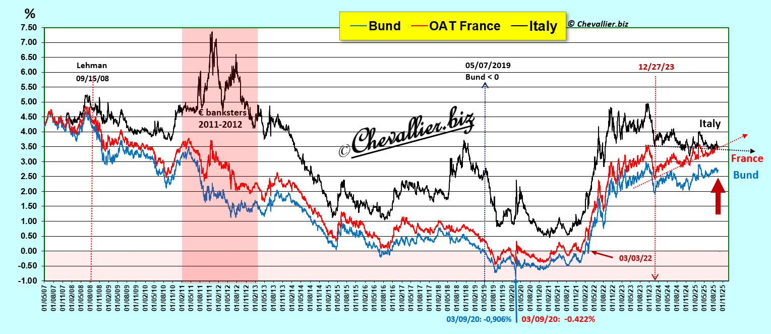 Les rendements européens montent, ce qui signifie que, inversement, automatiquement, mathématiquement, leurs prix baissent car les investisseurs sortent dans la mesure du possible leurs capitaux de cette région pourrie pour les placer… ailleurs.