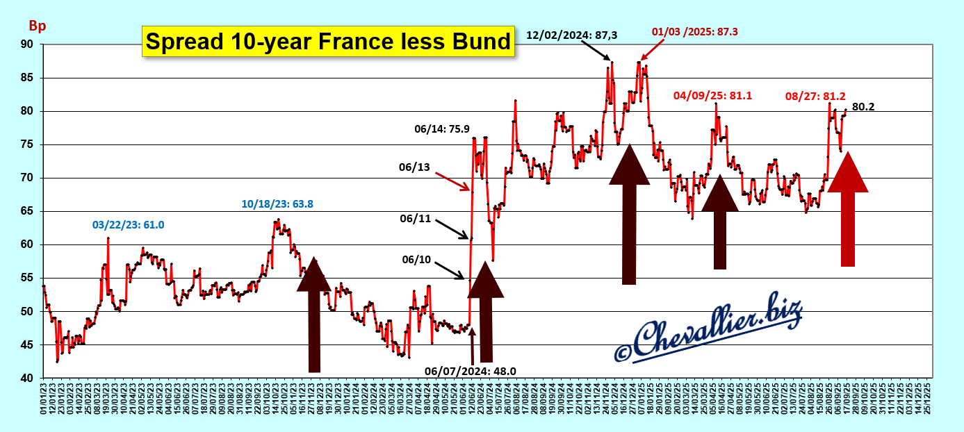 L’écart entre les bons à 10 ans du Trésor français et ceux du Bund fluctue aux alentours de 80 points de base depuis l’annonce de l’engagement de l’article 49.1 par Bayrou fin août !