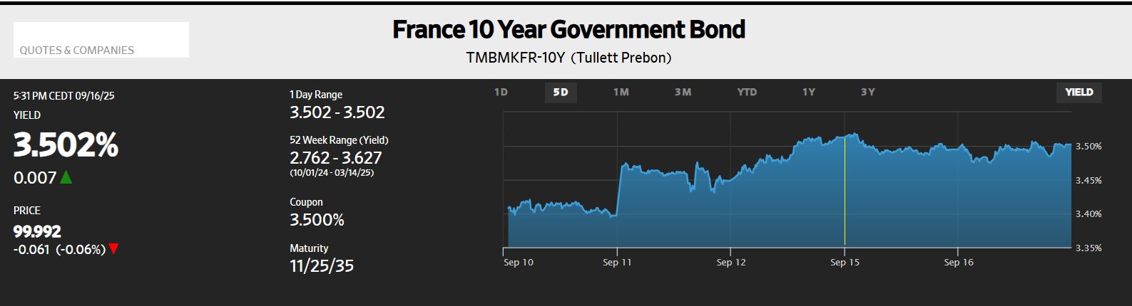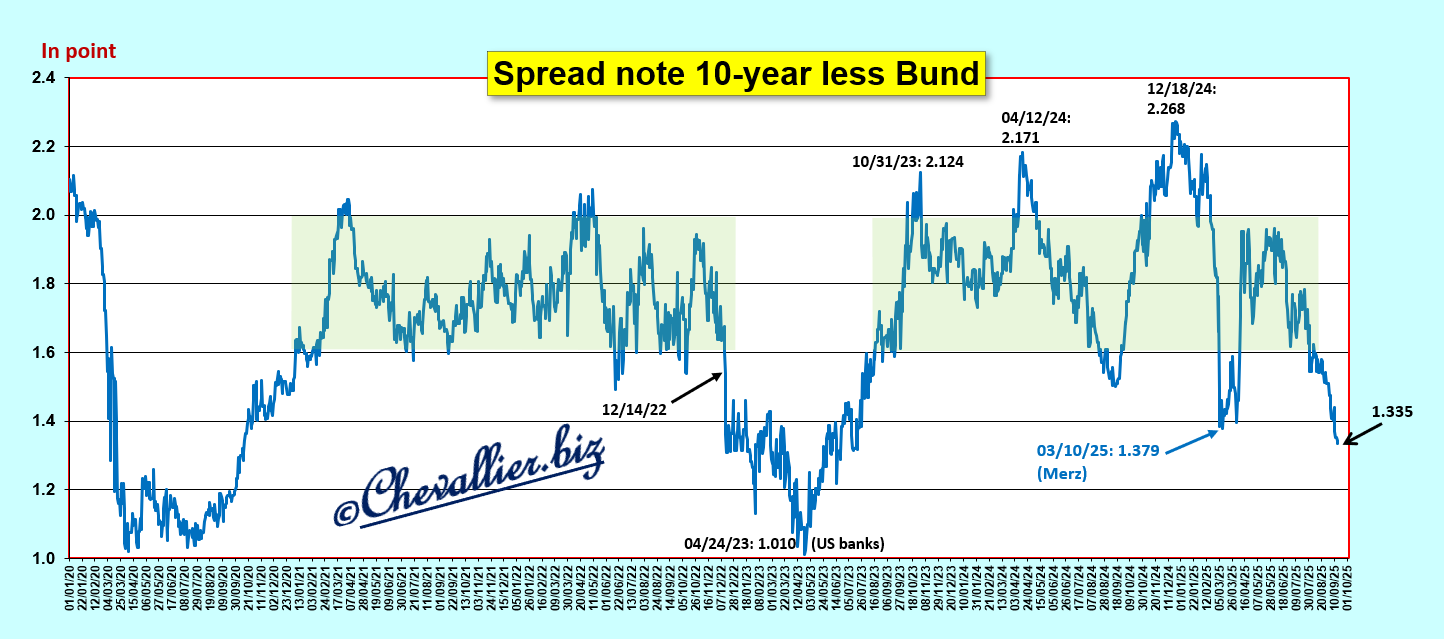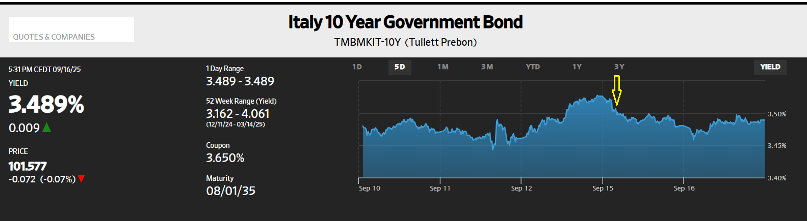 Les rendements des bons à 10 ans du Trésor français sont restés à un haut niveau lundi 15 septembre et le lendemain après la dégradation de la note souveraine de la France par Fitch Ratings vendredi 12 après la clôture des marchés américains alors que les rendements des bons à 10 ans du Trésor italien ont continué sur leur tendance baissière… ce qui a fait plonger leur écart (Italie / France) en territoire négatif : – 1,4 point de base lundi 15, plus bas record de ce cycle à – 1,3 point de base ce mardi 16 !