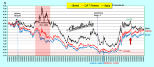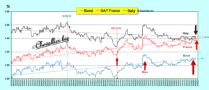 Pour rappel, la hausse des rendements de ces bons signifie que leurs prix baissent et inversement. Les investisseurs vendent donc du Bund et de l’OAT française et achètent préférentiellement des bons italiens.