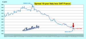 L’écart entre les bons à 10 ans du Trésor italien et ceux de la France est tombé à 5,9 points de base, nouveau plus bas record de ce cycle, contre 8,8 points de base la veille,