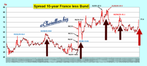 L’écart entre les mauvais bons à 10 ans du Trésor français et ceux du Bund a lui aussi rebondi à 77,4 points de base contre 73,1 points de base la veille !