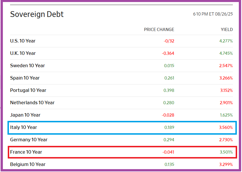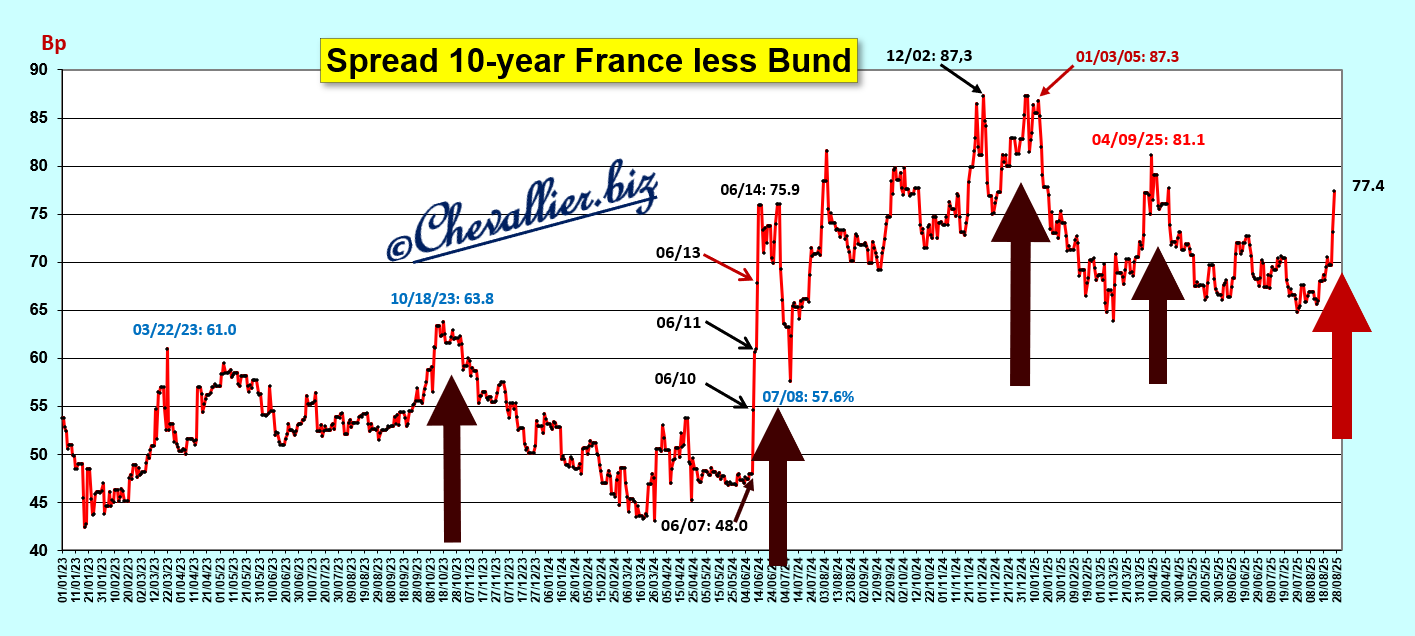 A la clôture de la séance de ce 26 août, les rendements des mauvais bons à 10 ans du Trésor français ont peu varié par rapport à la veille alors que leurs homologues de l’Italie et de l’Allemagne ont baissé, ce qui signifie que les investisseurs ont globalement vendu ces OAT françaises pour acheter du Bund et du 10 ans italien dans l’anticipation de l’aggravation de la situation économique, politique et sociale de la France.