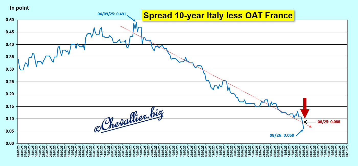 L’écart entre les rendements des bons à 10 ans du Trésor italien et ceux de la France s’est donc encore réduit ce 26 août…