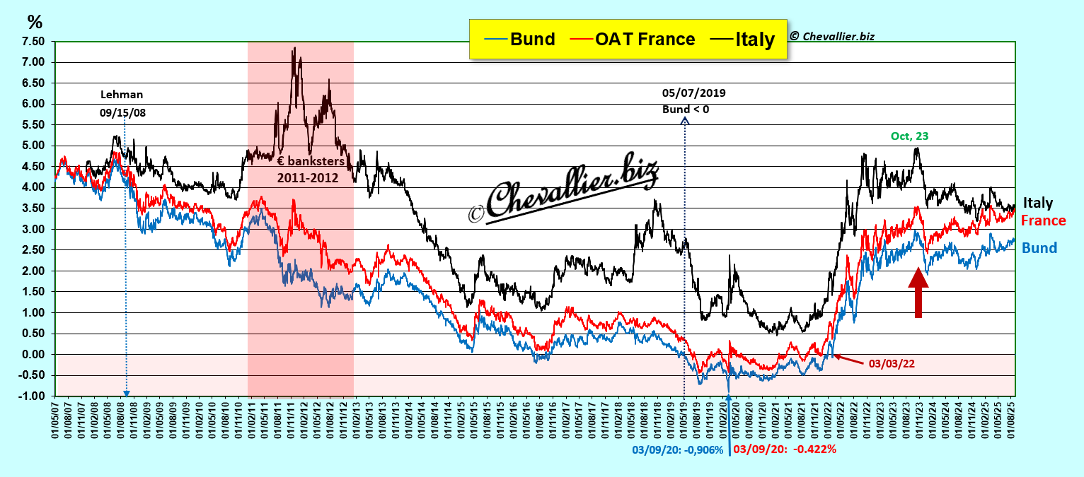 La situation de ce qui reste de la France continue à se dégrader fortement à cause de ses dirigeants politiques comme le montre l’évolution des rendements des bons à 10 ans des Trésors européens…