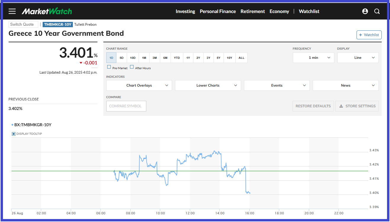 Etonnamment, les rendements des bons à 10 ans du Trésor de la Grèce ont plongé en fin de séance ce jour en étant maintenant inférieur d’un point de pourcentage par rapport à son homologue français !