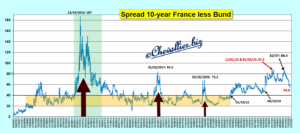 Toutefois, l’écart entre les rendements des mauvais bons à 10 ans du Trésor français et ceux du Bund n’a fait que de revenir dans une bande haute supérieure à celle qui était plus ou moins bien maintenue depuis 2007,