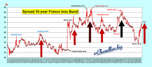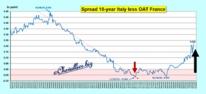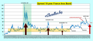 Par rapport au Bund, le 10 ans français qui était revenu dans sa bande de fluctuation habituelle depuis 2007 a bondi, ce qui signifie que la situation économique de la France se dégrade plus gravement que celle de l’Allemagne,