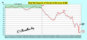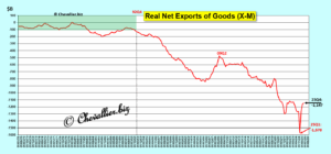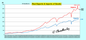 C’est ainsi que les importations de biens ont fait un bond prodigieux et historique au premier trimestre 2025 à 833 milliards de dollars (un quart de 3 332 milliards en valeur annualisée) alors que les exportations des producteurs américains n’ont augmenté que modérément,