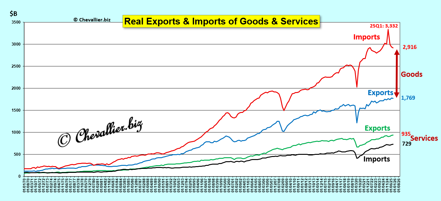 C’est ainsi que les importations de biens ont fait un bond prodigieux et historique au premier trimestre 2025 à 833 milliards de dollars (un quart de 3 332 milliards en valeur annualisée) alors que les exportations des producteurs américains n’ont augmenté que modérément,