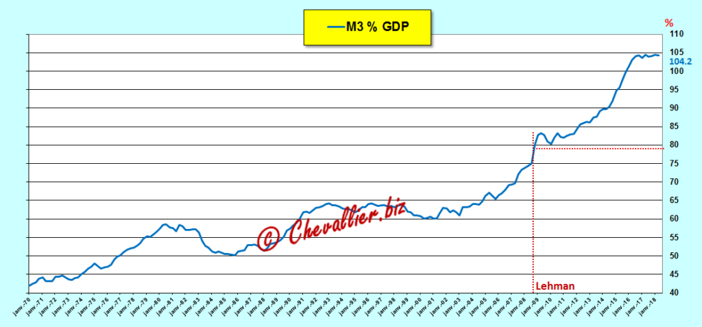 La courbe représentant l’évolution de la masse monétaire M3 par rapport au PIB (courant annuel, en pourcentage) du Canada révèle l’existence d’une bulle aussi importante…