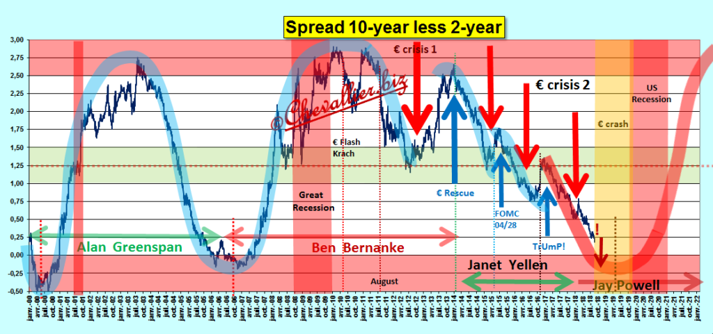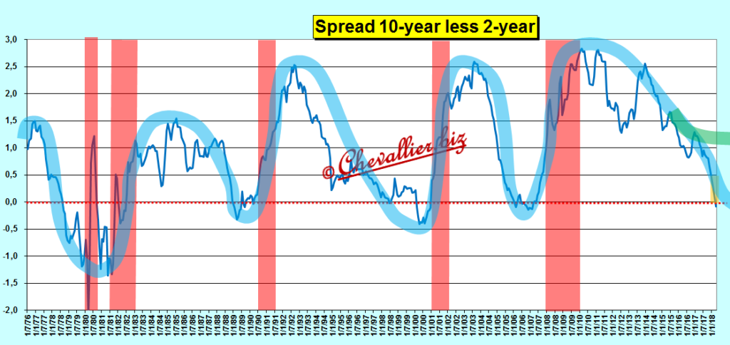 Des compléments s’imposent manifestement après mes derniers articles sur ce Yield spread 10y-2y qui est tombé quasiment à zéro… La courbe de ce Yield spread…
