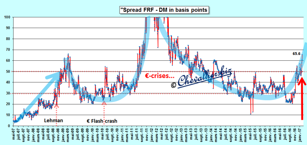 L’€-crise s’accentue… L’écart entre les rendements des mauvais bons à 10 ans du Trésor français et ceux du Bund bondit : il a atteint 65,6…