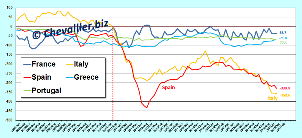 Je reprends ici en l’actualisant l’article que j’avais écrit en octobre dernier sur ce sujet qui montre bien que l’€-zone est en sursis… Les derniers…