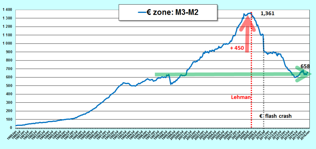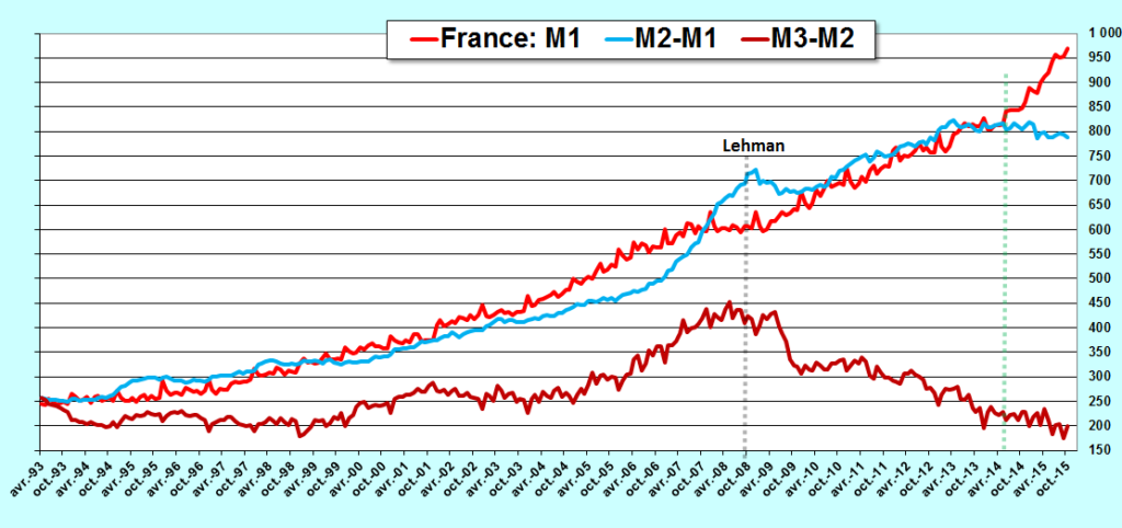 L’évolution des agrégats monétaires de la zone euro montre que la situation continue à se dégrader fortement depuis le début de l’année 2015… Document 1…