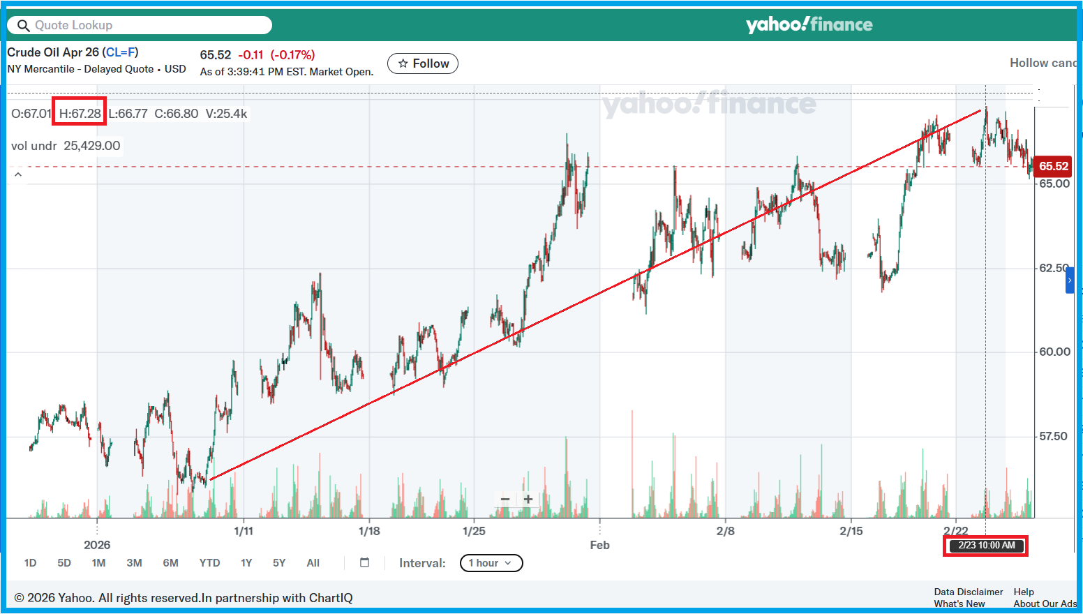 Une réponse fiable est donnée par le Crude Oil Apr 26 (CL=F) sur Yahoo Finance…
