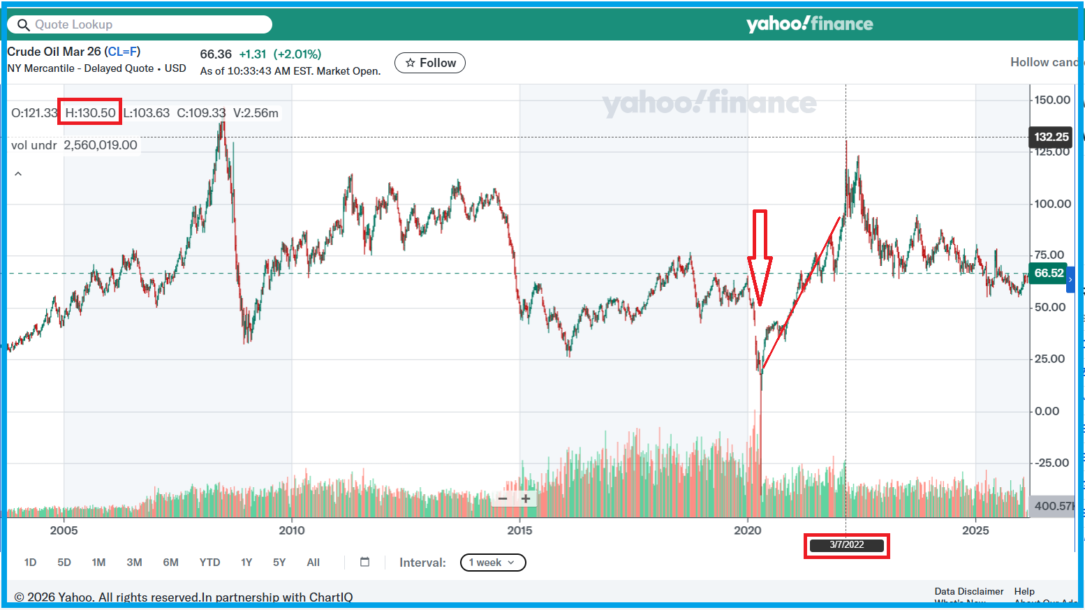 Oui mais sur la longue période, le prix du pétrole fluctue normalement autour de 65 dollars le baril alors qu’avant la guerre en Ukraine, il avait bondi et il en a été de même à partir de 2007 avant la Grande récession de 2008 !