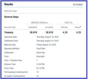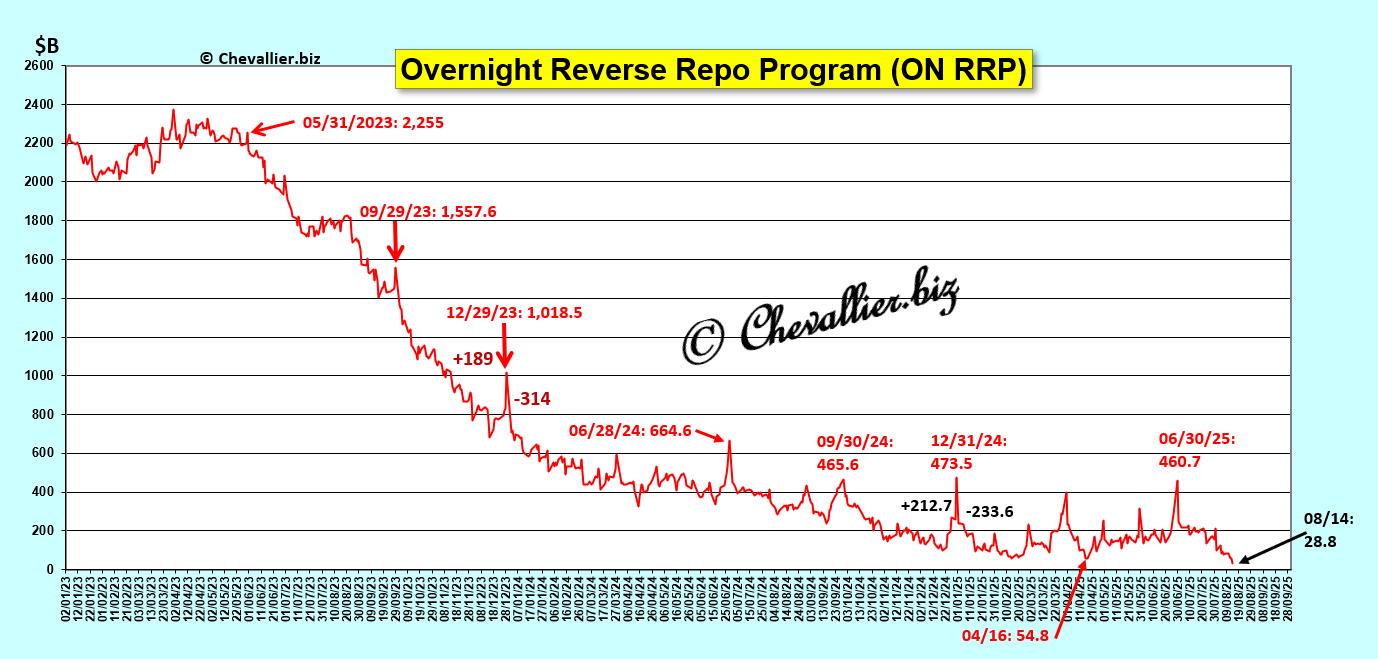 La Fed a reçu en dépôts 28,8 milliards de dollars seulement le 14 août émanant de banques bien gérées qui ont des liquidités excédentaires mais qui ne veulent pas les prêter à des banksters qui risquent de ne pas pouvoir les rembourser le lendemain !