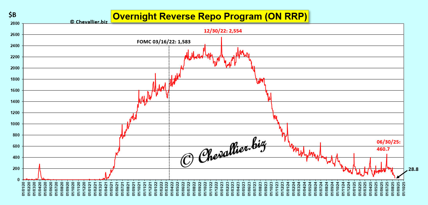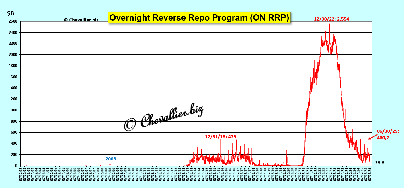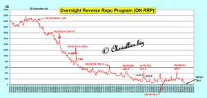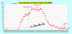 En conséquence, les dirigeants des bonnes banques déposent leurs liquidités excédentaires à la Fed d’un jour à l’autre, en overnight dans le cadre de la procédure dite de Reverse Repo (ON RRP).