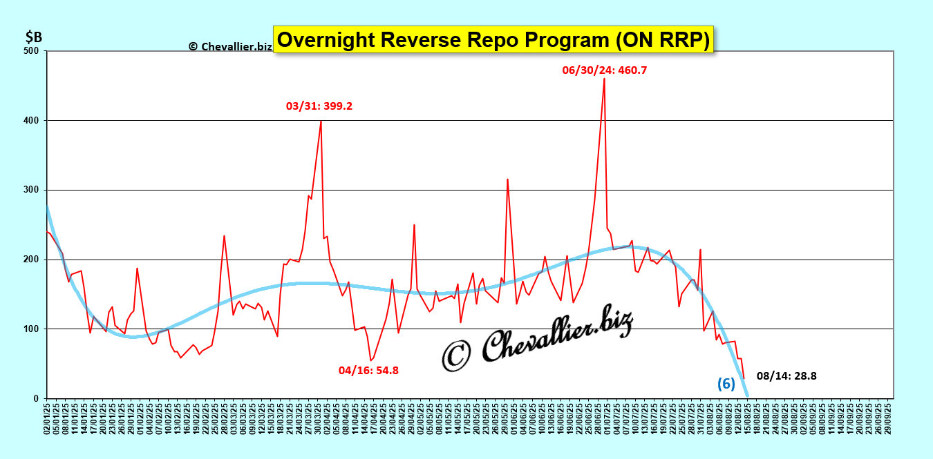 Depuis le printemps 2023, les banques bien gérées ont de moins en moins de liquidités excédentaires placées à la Fed dans le cadre de cette procédure de reverse repo et au 13 août, le système bancaire américain n’a quasiment plus de liquidités excédentaires !