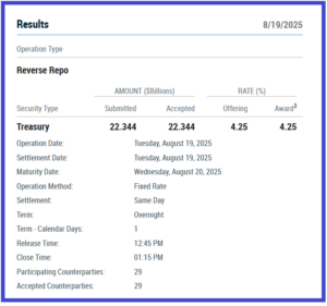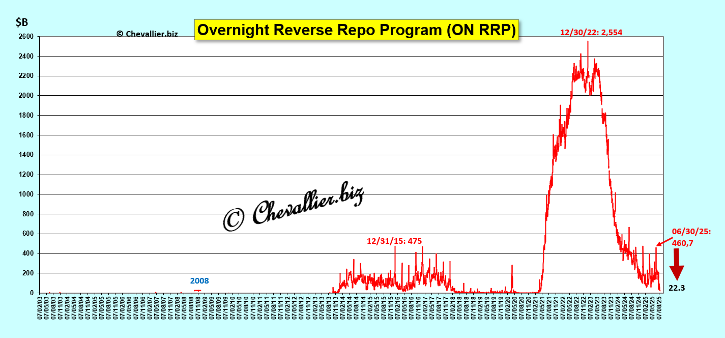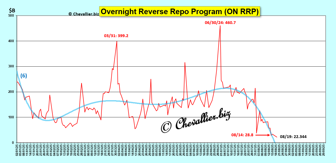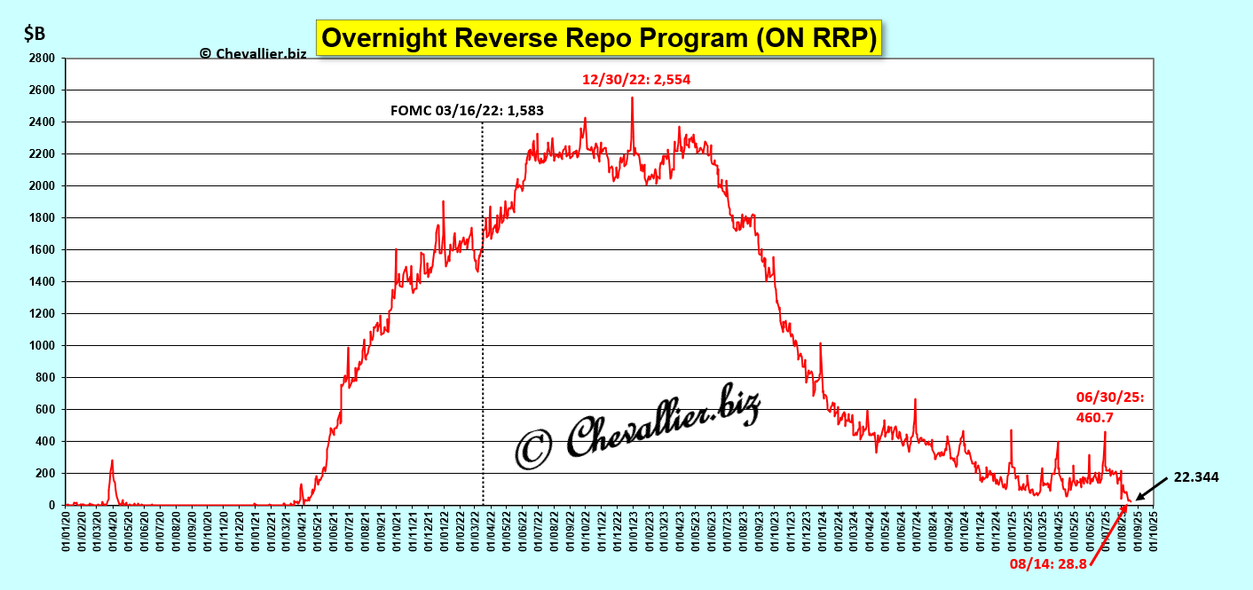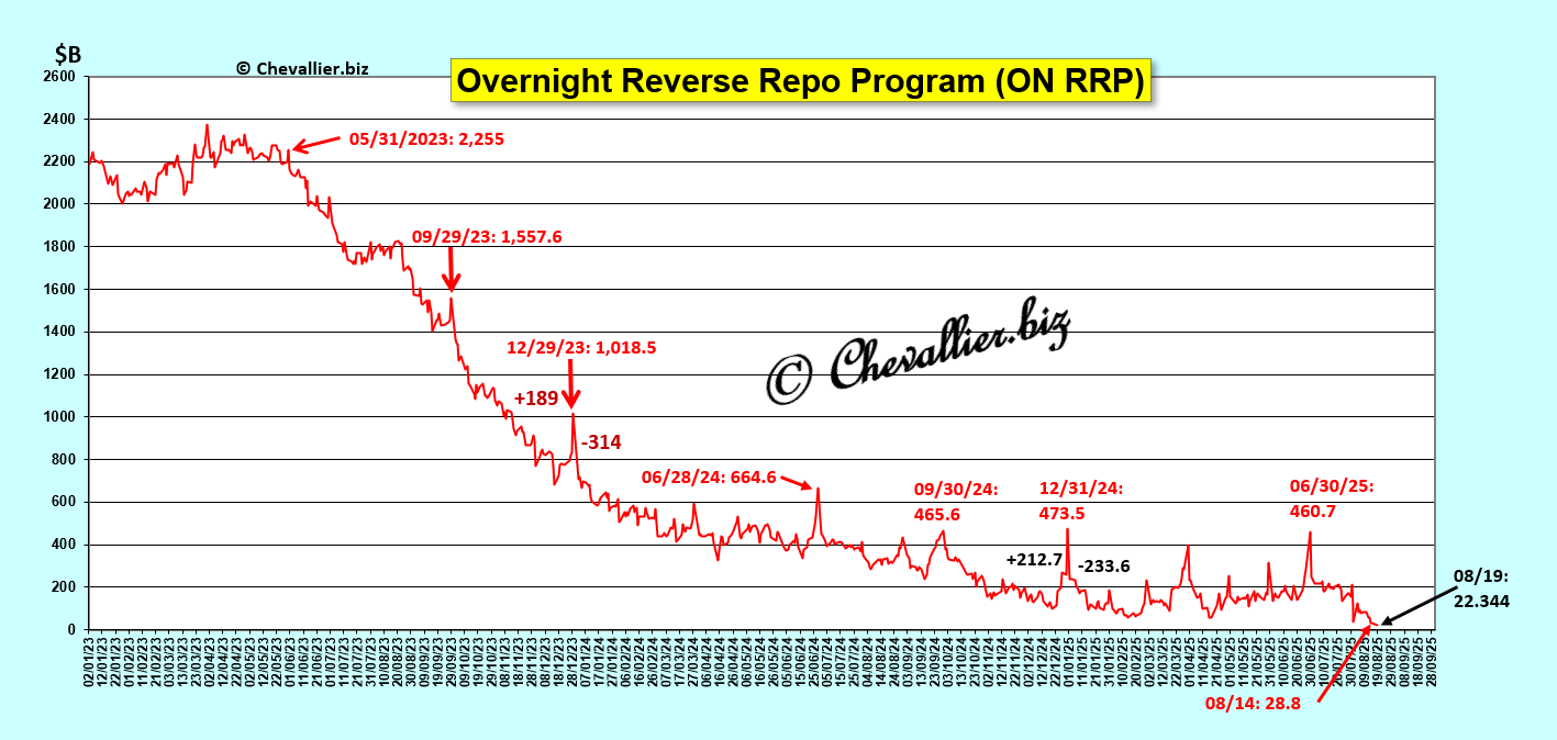 En effet, la Fed n’a reçu en dépôt que 22,344 milliards de dollars seulement ce 19 août, c’est-à-dire quasiment zéro, par rapport à ce qu’elles avaient précédemment !