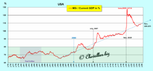 En d’autres termes, il faudrait ajouter à la masse monétaire totale M3 (qui se monte à 34 500 milliards de dollars) des États-Unis ces 5 800 milliards de dollars pour donner une image fidèle de la réalité, soit une masse monétaire de… 40 300 milliards de dollars, ce qui propulserait le ratio M3/PIB à des niveaux stratosphériques !