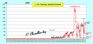 Enfin, la trésorerie du… Trésor est elle aussi anormalement importante. En effet, elle se monte à plus de… 900 milliards de dollars alors qu’elle était de l’ordre de… 5 à 10 milliards généralement avant 2008 !