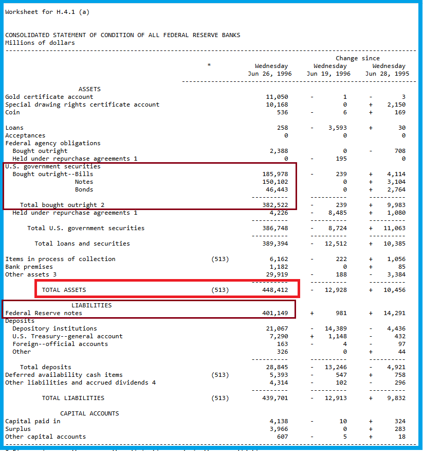 En effet, le dernier bilan hebdomadaire de la Fed le plus ancien encore publié à ce jour sur son site, datant du mois de juin 1996, ne fait apparaitre que pour 382,5 milliards de dollars de bons du Trésor pour un total des actifs de 448,4 milliards de dollars, ce qui peut être considéré comme étant normal car les dirigeants de la Fed peuvent et doivent pouvoir mener la politique d’open market qui leur apparait nécessaire pour réguler l’activité économique.