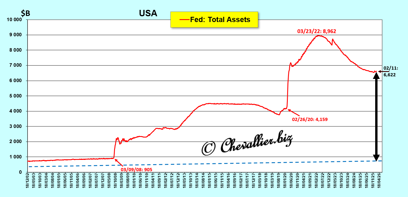 Le total des actifs de la Fed qui était inférieur à 500 milliards de dollars en 1996 aurait dû continuer à fluctuer à un niveau inférieur à 1 000 milliards de dollars présentement alors qu’il a bondi jusqu’à… 9 000 milliards de dollars au mois de mars 2022 pour se maintenir aux alentours de 6 600 milliards de dollars en 2026, d’après les données de notre ami Fred de Saint Louis,