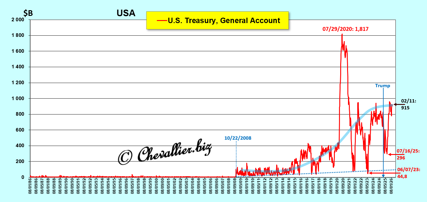 Enfin, la trésorerie du… Trésor est elle aussi anormalement importante. En effet, elle se monte à plus de… 900 milliards de dollars alors qu’elle était de l’ordre de… 5 à 10 milliards généralement avant 2008 !