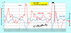 La baisse de l’augmentation de l’agrégat monétaire M2 provoque logiquement une augmentation de la croissance du PIB réel en application de ma loi de la masse monétaire libre.