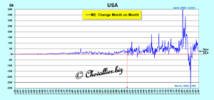 Les variations d’un mois sur l’autre de l’agrégat monétaire M2 ont été de faible ampleur au XX° siècle mais tout a changé à partir de l’an 2000 : ces variations sont devenues de grande ampleur, totalement hors normes, surtout en 2020 (à cause de cette histoire de coronavirus) et en 2023 du fait du stress provoqué par le plongeon de trois banques américaines sauvées de la faillite dans des circonstances extraordinaires,